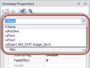 Provides access to the drawing properties. If no selection set exists in the drawing the general document properties are presented. If a selection exists then the common properties of all items in the selection set are displayed for edit. You may also select a single item from the selection set and edit all of its properties.