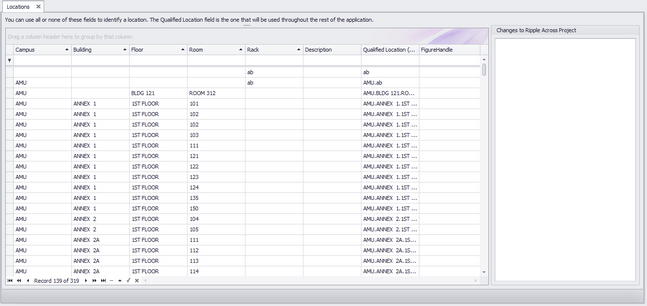 This is the main Locations table view. You can print, export and edit this view. Changes to this grid can be rippled throughout the project.