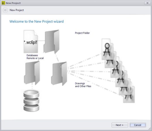 WireCAD Projects are a loosely coupled collection of files, folders and databases. The New Project Wizard will guide you through the steps of creating a new Project with several different options for different database types.