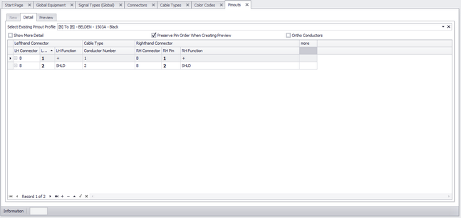 This tool provides access to the Pinouts table of the Global Equipment database. The concept of the Pinouts tool is to create a data set that describes two connectors and the conductors between them. The Cable Type data needs to have conductor level data. The data may be attached at the project level to a cable. The data can also be churned into a preview.
