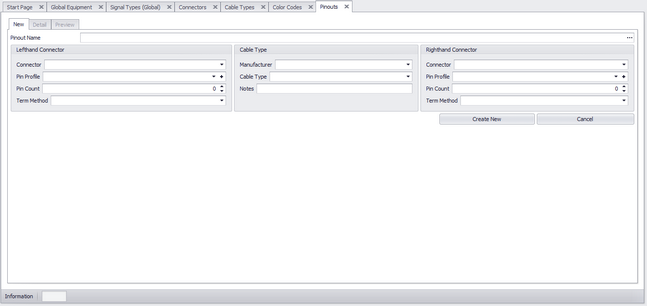 Clicking the New button enables the New Tab. From here you enter the overall data for the pinout. The Lefthand and Righthand connectors conductor counts, etc. Once the pinout is created you can edit the detail in the Detail tab.