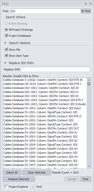 The Find and Replace tool window allows you to search all of the data collections and drawing. You may then replace found text with that of your choosing.