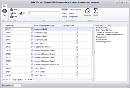 Often we need to count items in the plan view space for quoting or other purposes. The Take Offs tool facilitates this process by filtering the drawing for specific entity types on specific layers then counting those instances.