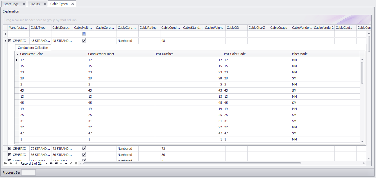 The list is hierarchical and shows the relation of a Cable Type to its Conductors Collection.