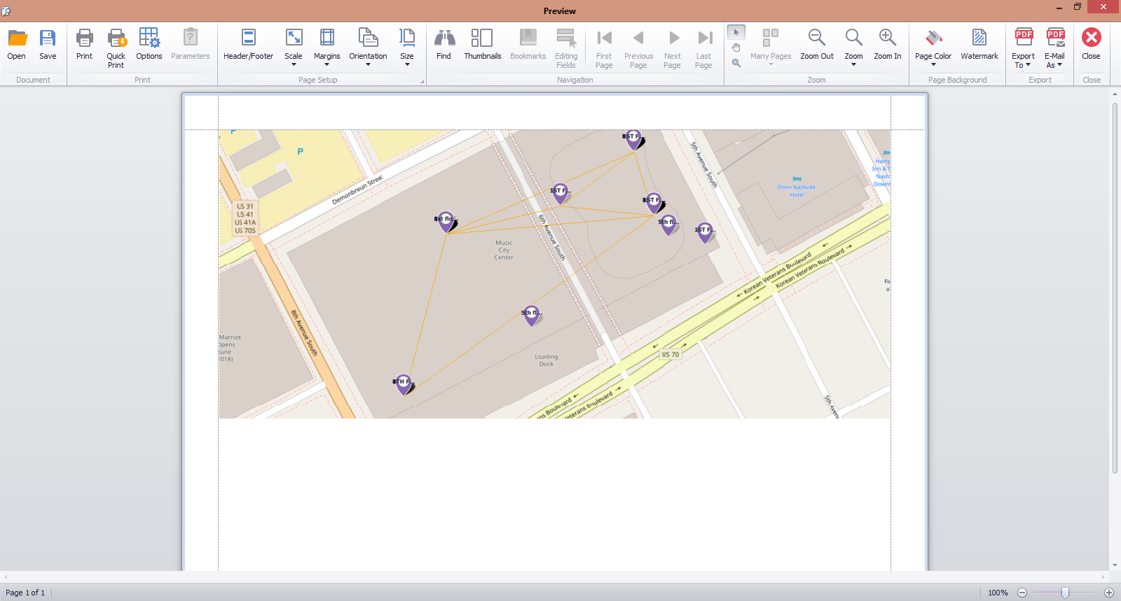 The print preview dialog can be used to send the current map view to the printer or exported to several file formats.