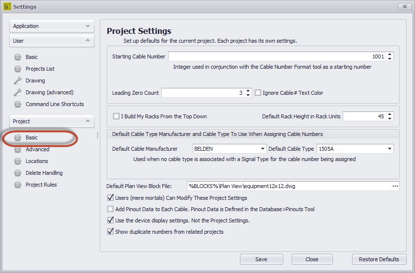 •Default Cable Type - This is the default of defaults. The Project Signal Types table can override this.