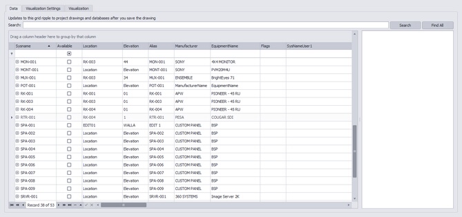 The Equipment List Visualization tool utilizes information in the Project Systems table and the Global Equipment Library and the Project Cables database to create a view of all cables attached to the selected item.