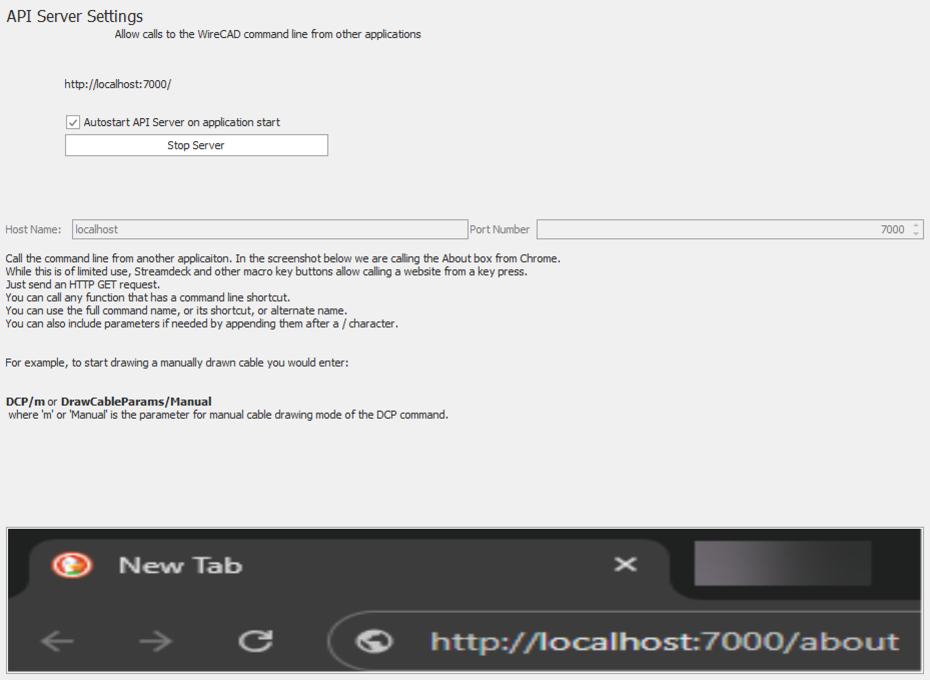 Plugin settings must match those of the WireCAD API Server. You only have to configure these settings if you have not used the default settings in WireCAD.